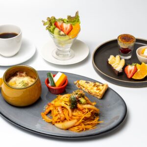選べるメインのお料理に、賢美フルーツサラダ、フルーツスープ、季節のフルーツスムージー、特製デザート、ドリンクがついた果物屋さんならではのコースメニューです。
