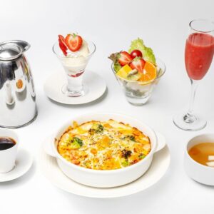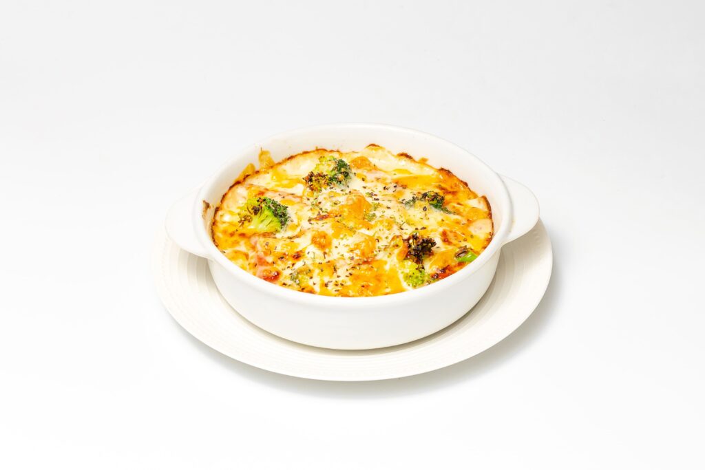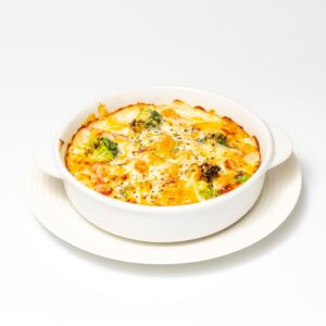 十五穀米に季節の野菜とトマトソース、ホワイトソース、チーズを合わせ、オーブンであつあつに焼き上げたドリアです。
