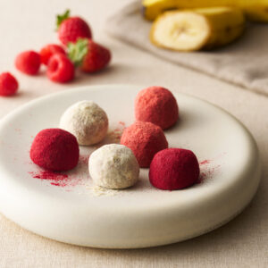 風味豊かなフルーツのフリーズドライパウダーと粉糖でほろほろクッキーをコーティングしました。