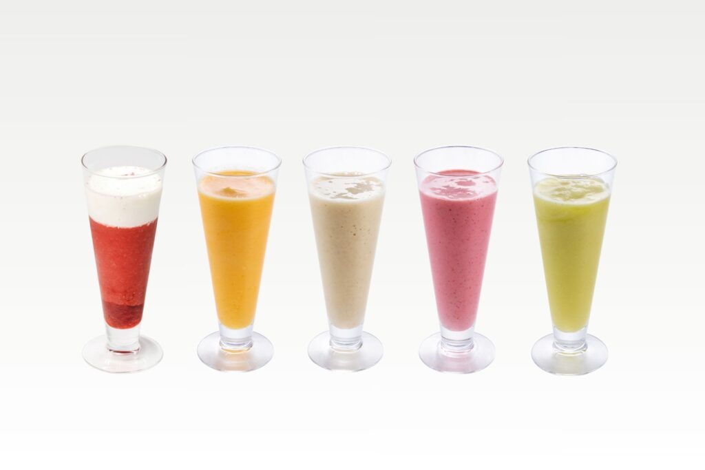 バナナミルク、いちごミルク、マスクメロン、パイン&オレンジ、季節のスムージーの5種類をご用意しております。