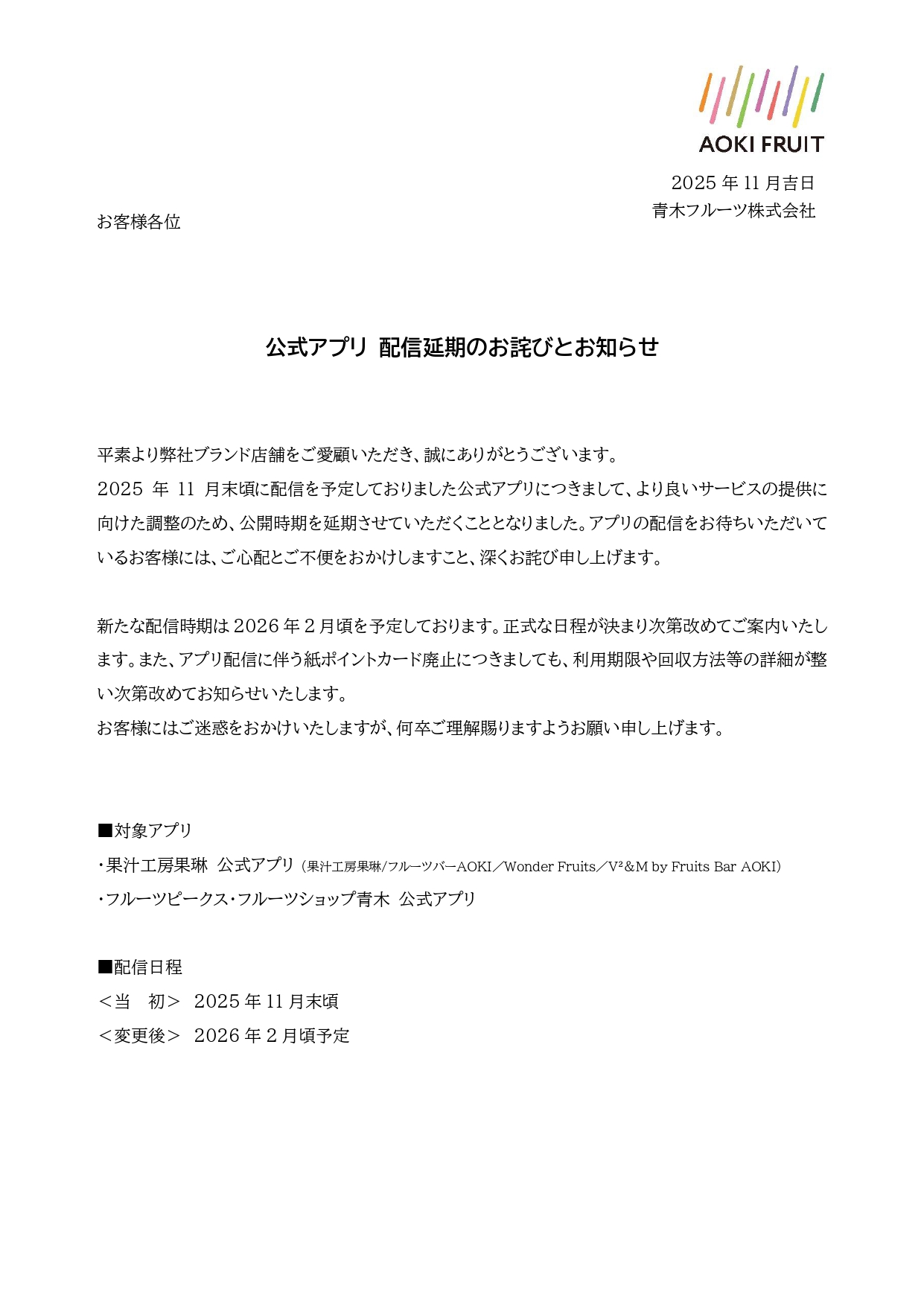 2025年11月末頃に配信を予定しておりました公式アプリにつきまして、より良いサービスの提供に向けた調整のため、公開時期を延期させていただくこととなりました。