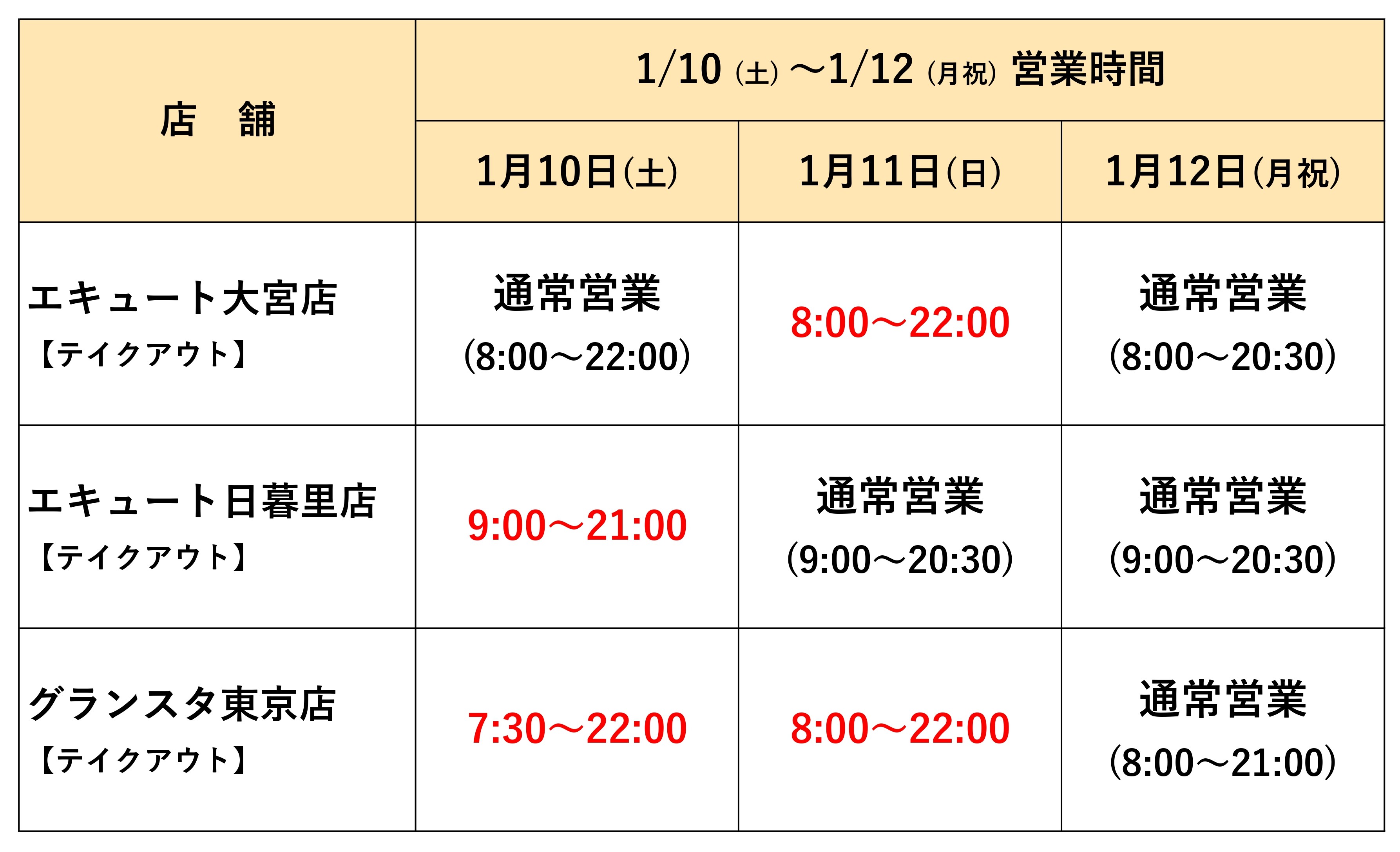 1/10(土)~1/12(月祝)期間中、上記の通り営業時間を変更致します。